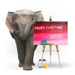 This Christmas painting by the exceptionally talented elephant, Suda, is not just a piece of art but a personalized keepsake. The artwork encapsulates the festive spirit with its Christmas-themed elements, while also providing a unique opportunity for the buyer to add a name of your choice next to the Christmas message. This personal touch transforms the painting into a special and heartfelt gift, making it not only a beautiful piece of art but also a cherished memento of the festive season.